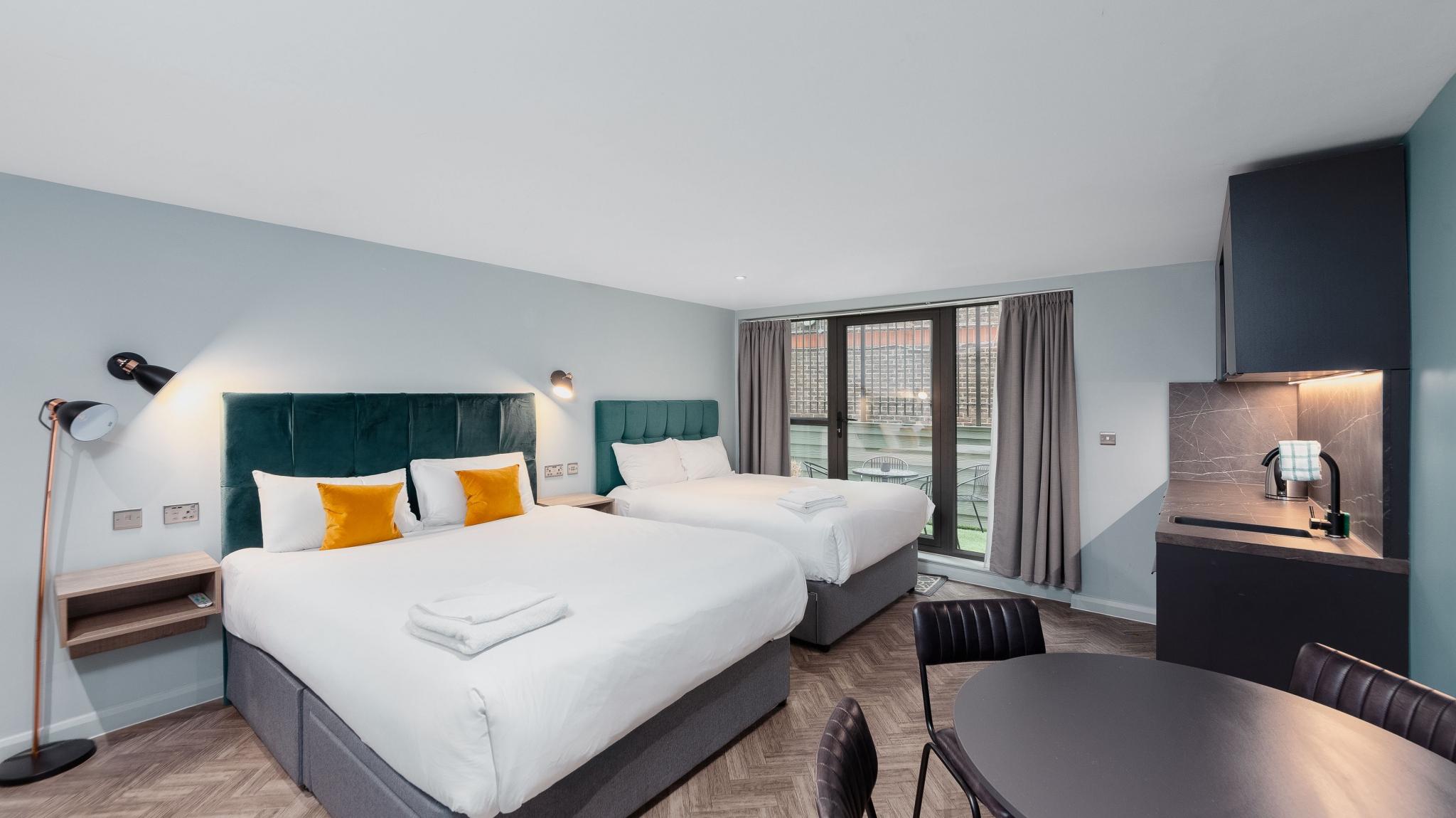 Aptel East apartments all include full air conditioning, a bespoke kitchenette, 43” TVs, highspeed Wi-Fi, toiletries, hypoallergenic bedding made exclusively for Aptel East and a 24hr reception.